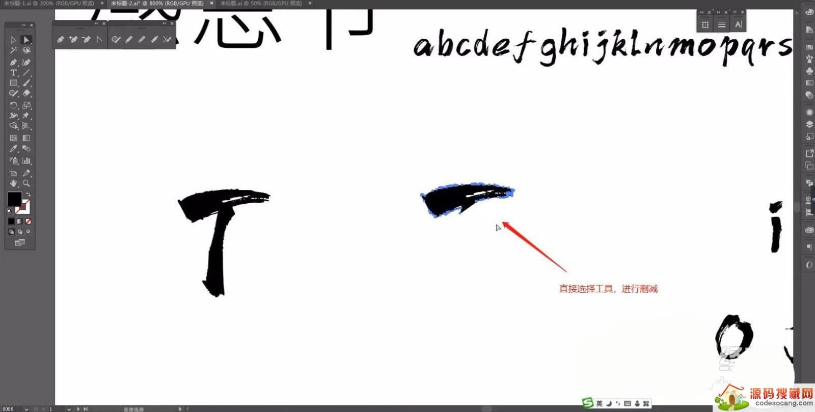 利用“字体预设”输入“拼音字母”,然后利用拼音字母进行“扩展”,使用【直接选择】工具【快捷键:A】对【锚点】进行调整,修改形状,具体如图示。