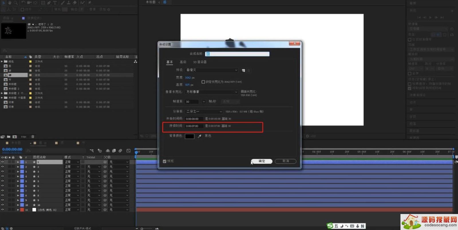 打开【合成】设置面板,然后在面板中将数值设置为【3062*1871】的尺寸信息,然后设置【持续时间为:7秒】。