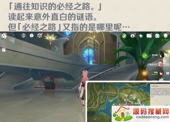3、谜题三:进入智慧宫,在门口的桥下方获取精致的宝箱以及第四条谜语。