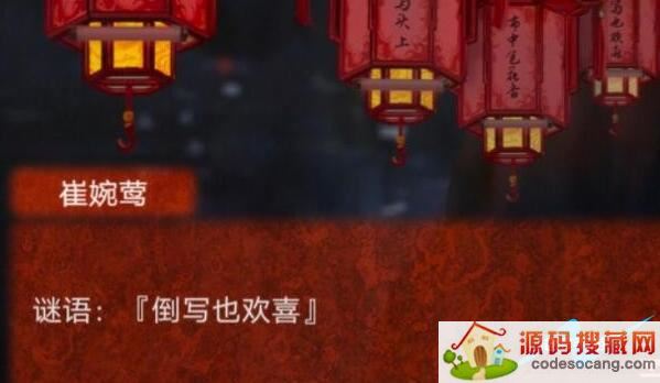 在纸嫁衣4红丝缠第二章中,有一个灯谜的玩法,其中有个谜语是倒写也欢喜,不少玩家不知道答案是什么,下面小编为大家带来了纸嫁衣4倒写也欢喜谜语答案介绍。