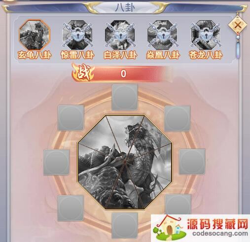 玩家的八卦根据飞升境界进行开启,依次为玄龟八卦、惊雷八卦、白泽八卦、炎凰八卦、苍龙八卦。八卦部位装备八卦牌之后即可使用强化石对不同部位进行强化,只有装备了八卦牌的部位才能进行强化,强化后增加的属性直接添加到主角人物身上。