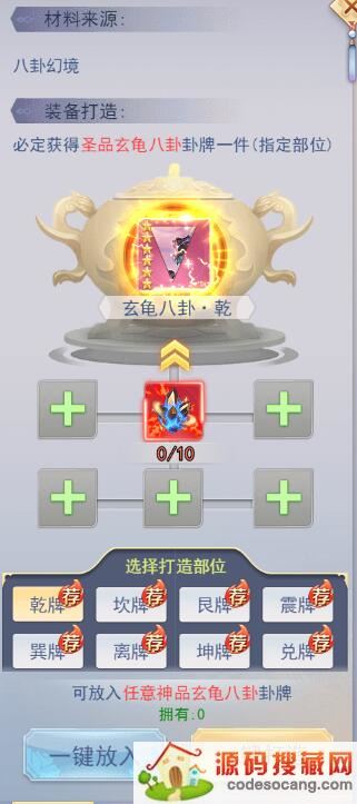 开启条件:主角等级四转四重并且飞升一阶开启。玩家开启八卦系统后,可通过装备八卦牌增加属性。八卦共有八个部位,七种品级,品级越高属性越好。八个八卦牌都装备之后即可激活套装属性。
