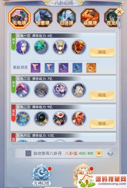1、玩家可以前往八卦幻境获取八卦,八卦幻境分为5个境界,每个境界需要对应的八卦开启后才能同步开,而每个境界共分5层,1、2两层为和平层,3至5层为混乱层,会受到其他玩家攻击。