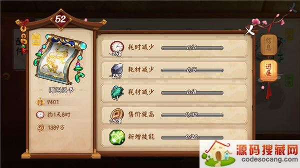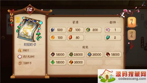 最终阶段的图纸为河洛图书,隶属于配件中的兵法类,等级为52级稀有度为极品,资源需求偏矿石铁类,装备配件为41级紫色兵法五岳真形图,属于同一类型的主线图纸,这也大大节约了玩家的装备制作时间。