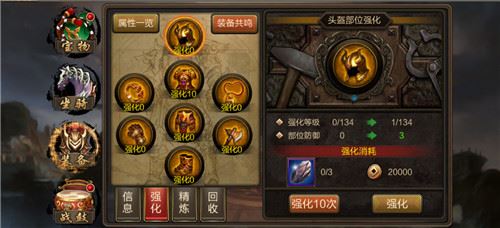 装备部位可进行强化与精炼,部位强化/精炼的属性将附加到装备上,最终生效于所有武将。强化部位需消耗铜钱与强化石,强化之后会提升对应部位的属性加成,当前最大强化等级=玩家当前等级*2;精炼部位需消耗精炼石,精炼之后会提升对应部位的固定值属性与百分比属性,百分比属性将针对穿戴在该部位的装备生效。