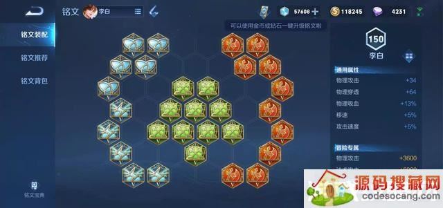 这里我推荐大家用这套铭文:蓝色5狩猎5夺萃,绿色10鹰眼,红色10纷争。这套铭文虽然前期减少了36点物理穿透,在一定程度上减少了前期的伤害,但这在后期是无关痛痒的。大家注意,带这套铭文的话,我们前期就有13%的物理吸血。