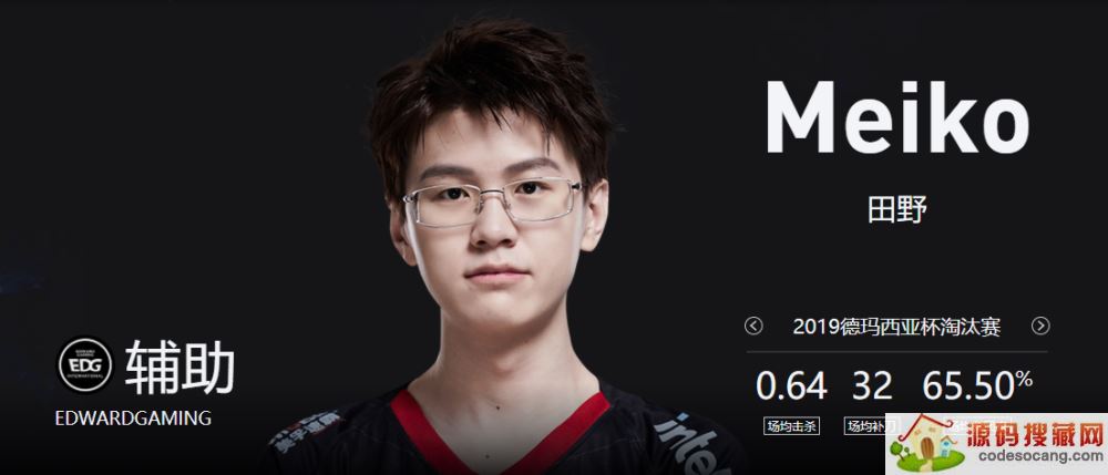 田野(游戏ID:Meiko),1998年6月6日出生于云南省楚雄彝族自治州禄丰市,英雄联盟职业选手,司职辅助,前英雄联盟Ray战队选手,现效力于EDG电子竞技俱乐部。
