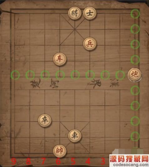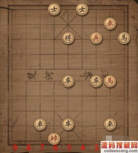 残局一:车5平6,马2退4,马4退5,马5退7,马7进8,炮9进三格,将军。