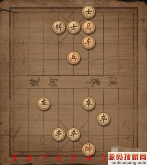 残局四:兵2平3,炮9退一格,马7退6,兵3进一格,马7退5,炮9退一格,将军。