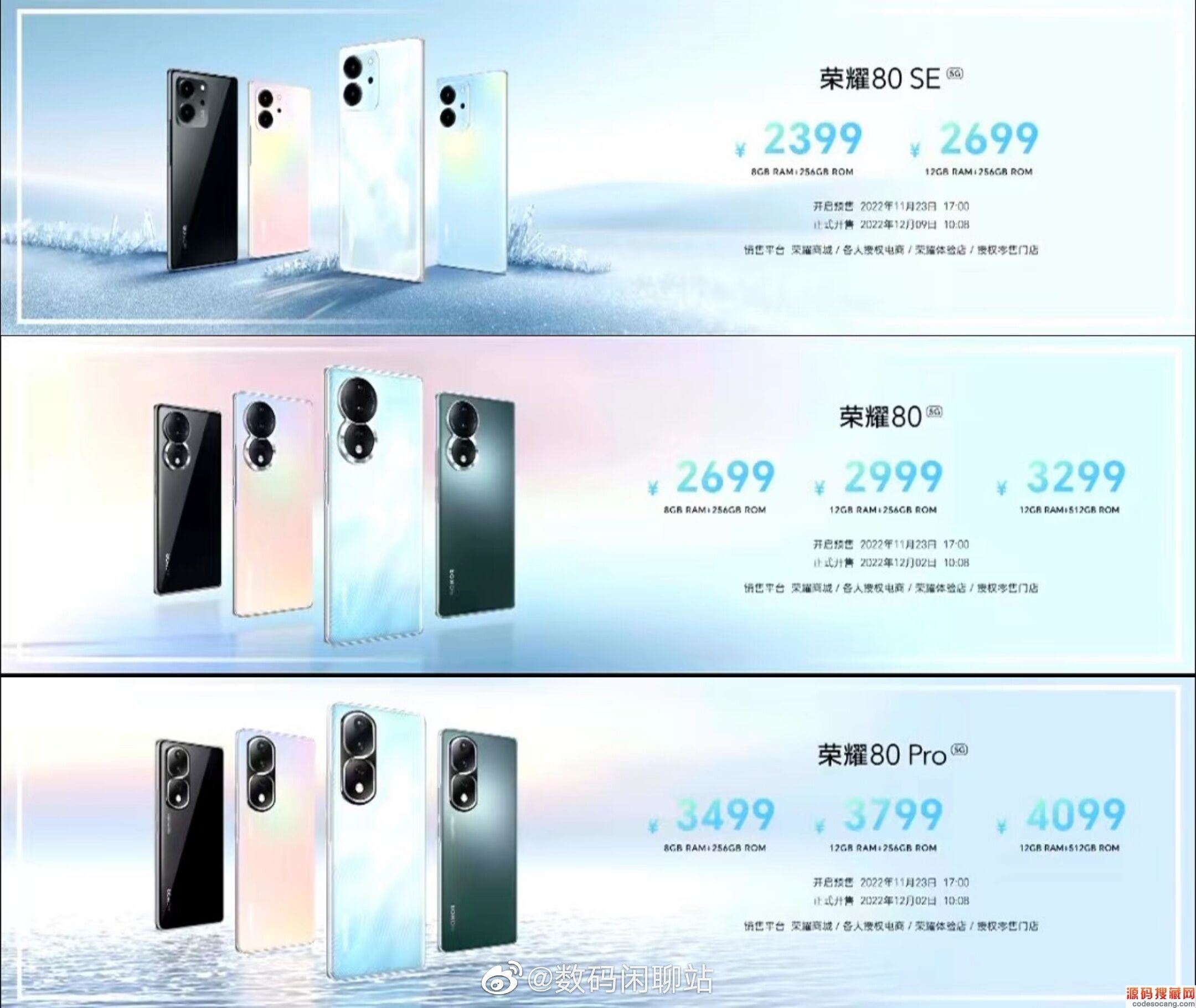 荣耀80SE :8+256GB版本2399,12+256GB版本2699;