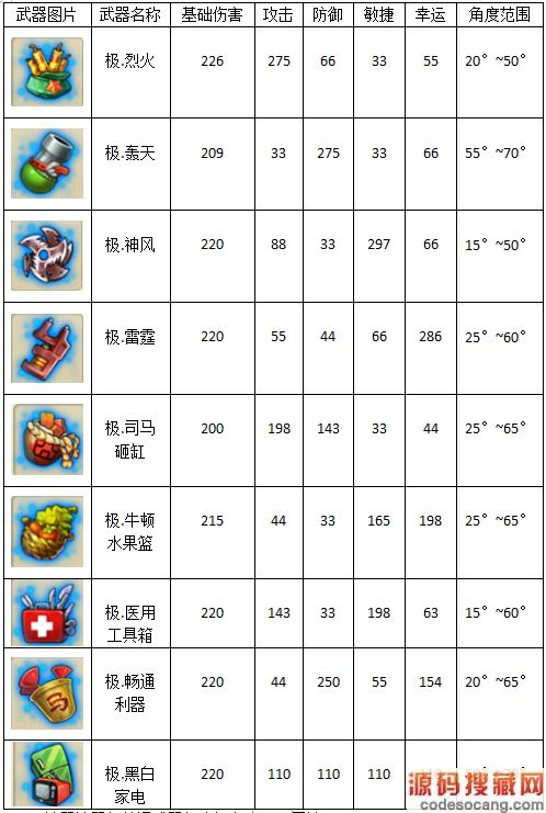 不同的武器拥有的有效攻击角度,基础伤害属性、攻击、防御、敏捷、幸运属性均不相同,产生的攻击效果也各有特色。