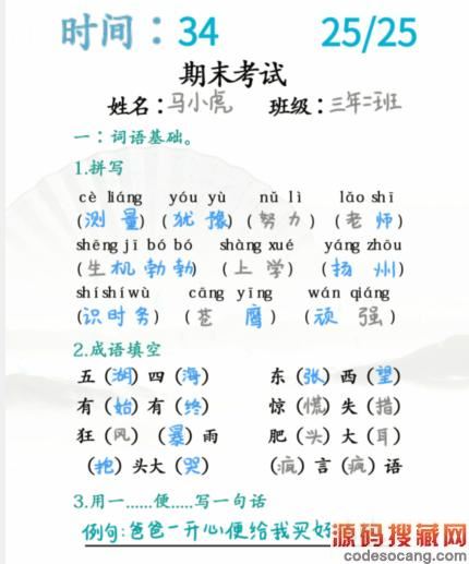 1、批改试卷-找出25个错误分别有:色狼、鱿鱼、帅、鸡伯伯、羊粥、食食物、蝇、顽、五八四十、东邪西毒、有车有房、抱雨、你头大吗,以及最后一个造句