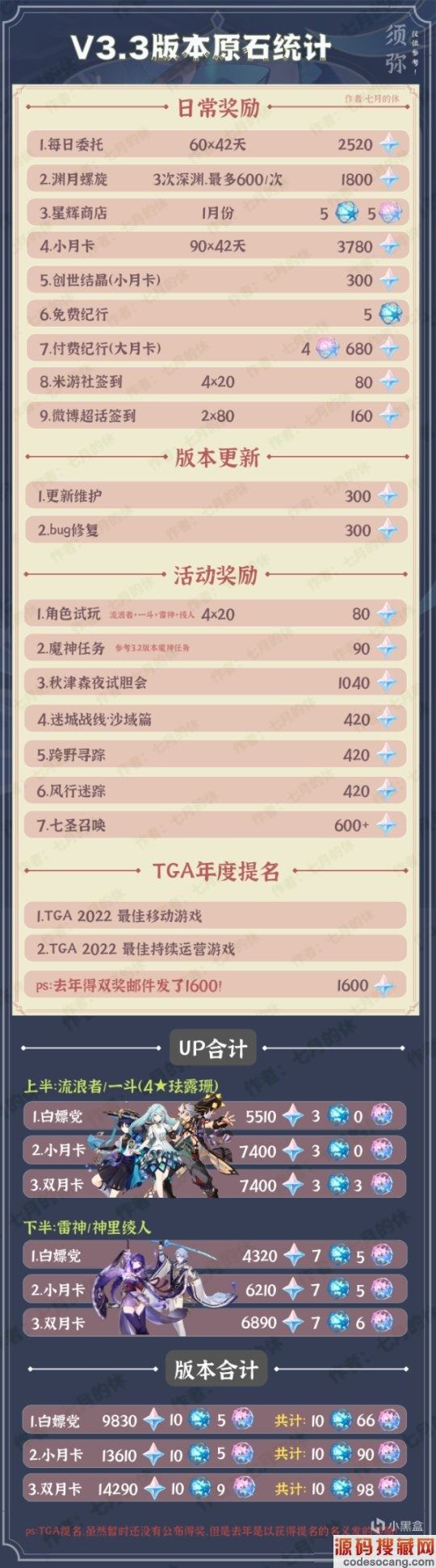 5、 关于七圣召唤这个常驻玩法,楼主这里参考了尘歌壶等级奖励为600,但是尘歌壶还有角色赠礼目前有超过2000原石了,所以因不清楚具体规则,所以这里写600+,上下半各分一半!
