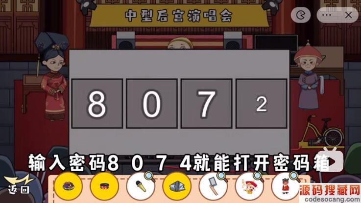 2.向下滑动太监的拉链,衣服会变成黑色,可以获得空袋子,把衣服给皇上穿上,就可以获得密码8074。