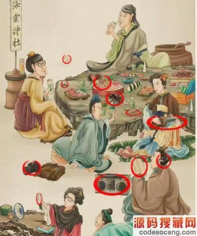 2、左下角的女人拿着手机,旁边绿衣服的人拿着游戏机,上面还有一个录音机、一个相机