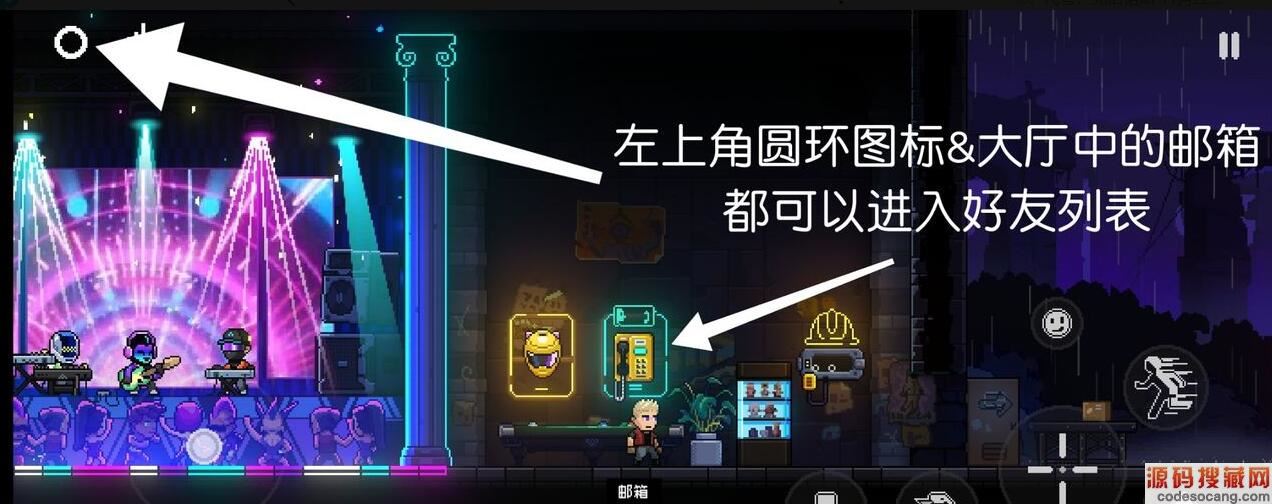左上角圆环图标&大厅中的邮箱都可以进入好友列表