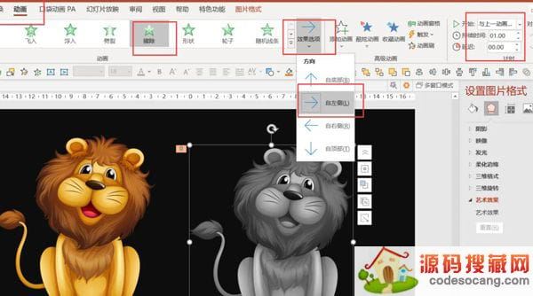 3、点击灰色图片-动画-擦除-自左侧-与上一动画同时-持续时间1秒。