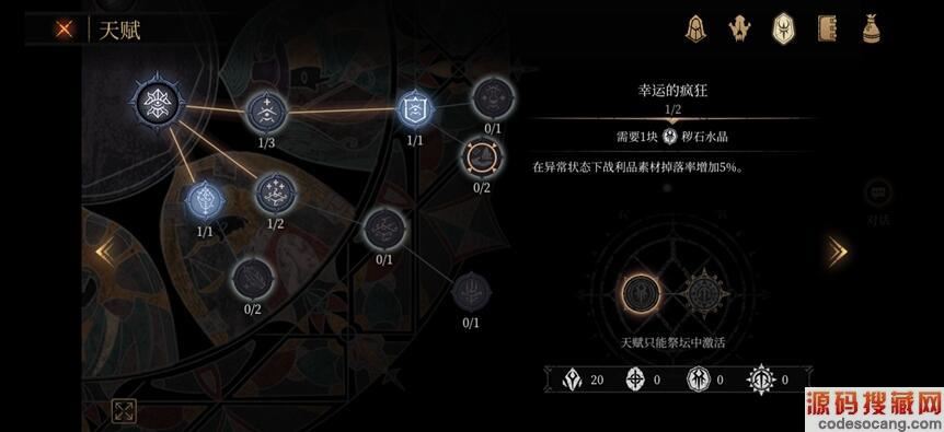 1、在角色蓝色天赋中,有个叫做幸运的疯狂的天赋,可以在异常状态下战利品素材掉落率增加5%,如果大家想刷素材,可以把这个天赋点一下。