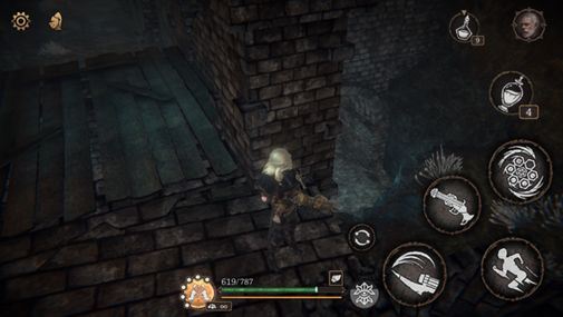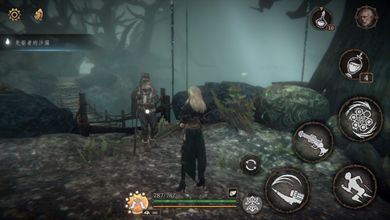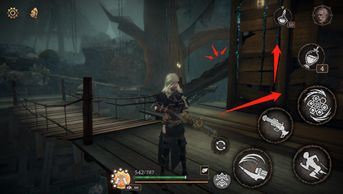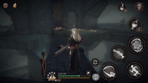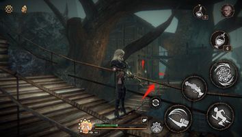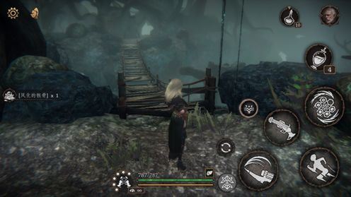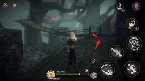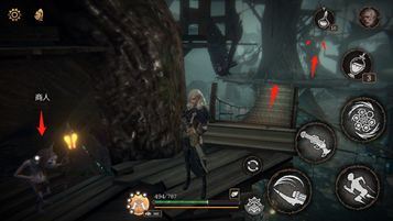 8、再从小屋下去,到第二个吊桥那里,会遇到黑精商人,经过圆盘平台上楼梯,杀掉斧头怪,然后继续往吊桥的尽头前进。
