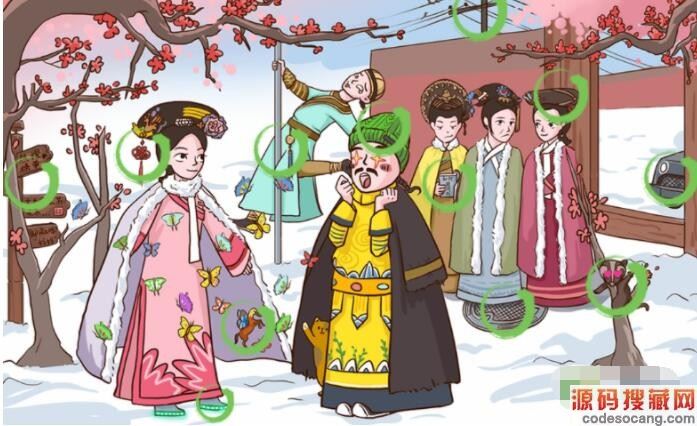 3、中间的皇上戴着帽子,后面的人在跳舞;墙后有电线杆和汽车,前面黄衣服的人拿着书,粉衣服的人头上是拖鞋