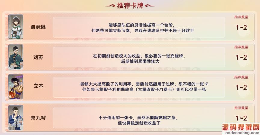 2、推荐购买:基本有1张就够用了,像是常九爷或者刘苏的卡牌可以考虑两张。