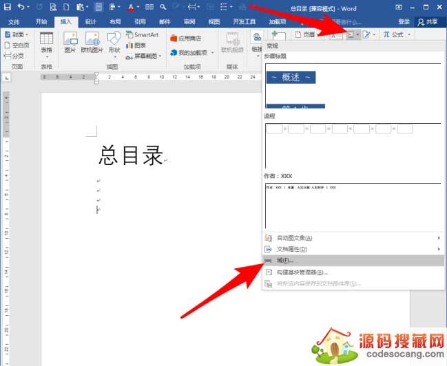进入到总目录文档中,点击【插入】【文档部件】【域】。