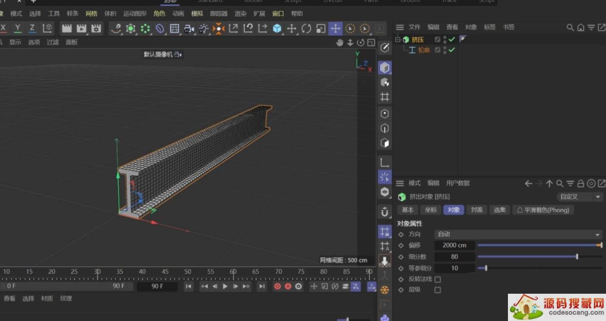 给”工“字形轮廓样条线添加一个挤压生成器,挤压的偏移值为2000CM,细分数为80,将得到实体模型的挤压生成器转为可编辑对象。