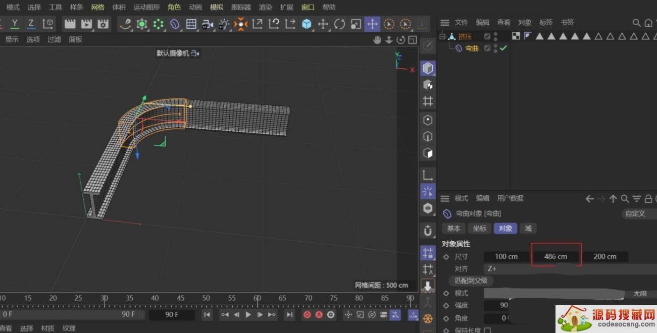 添加弯曲变形器到工字钢模型的子集,变形器的对象属性中,点击匹配到父级后,调整变形器Y方向的长度,用来控制弯曲圆角的半径,设置弯曲强度为90度,即可得到90度弯的工字钢模型。