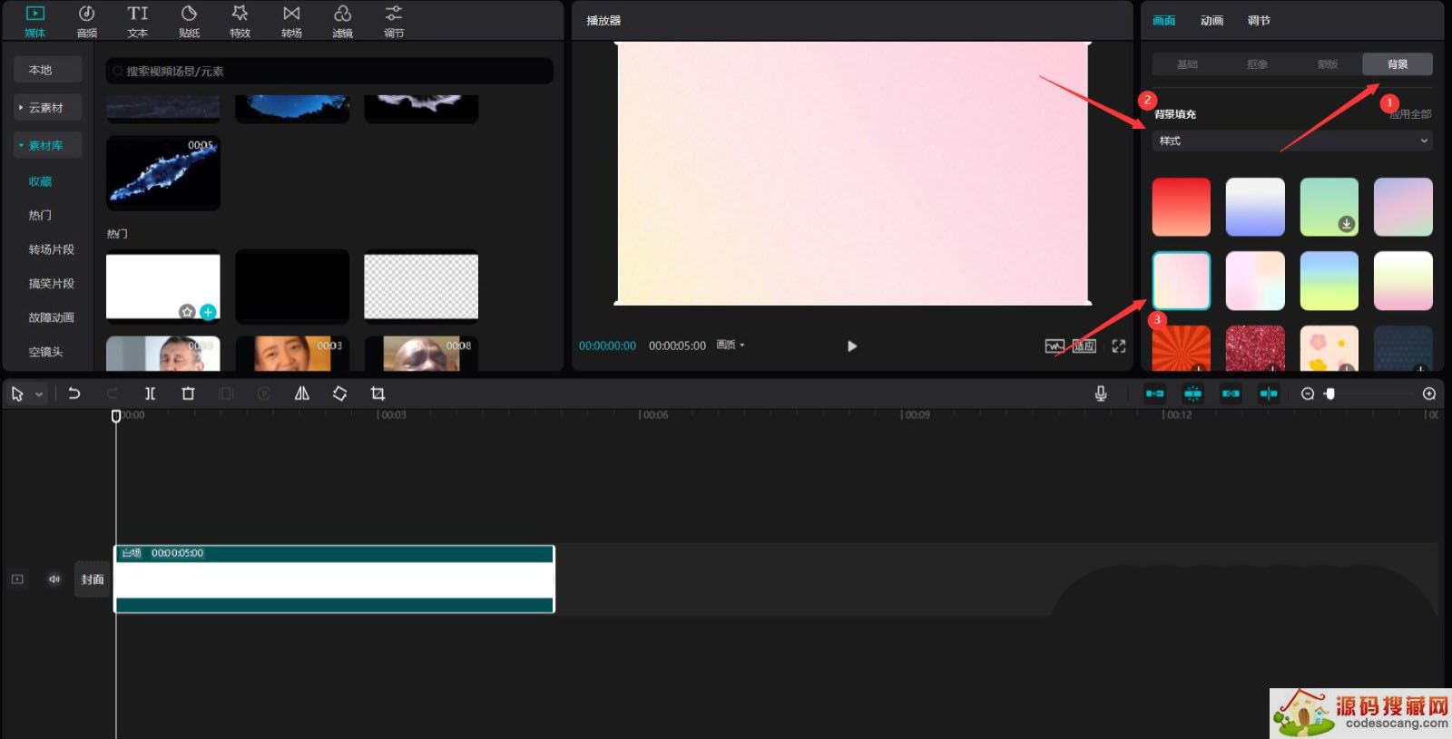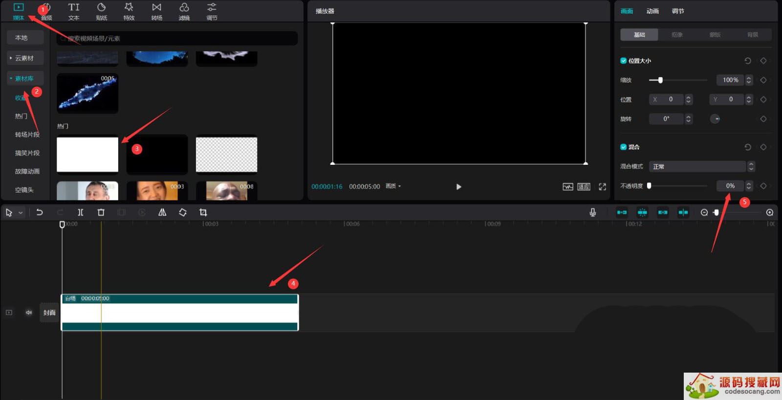 点击媒体按钮,然后点击素材库按钮,选择白场素材,将其添加到视频轨道中,更改不透明度为0%,见下图。