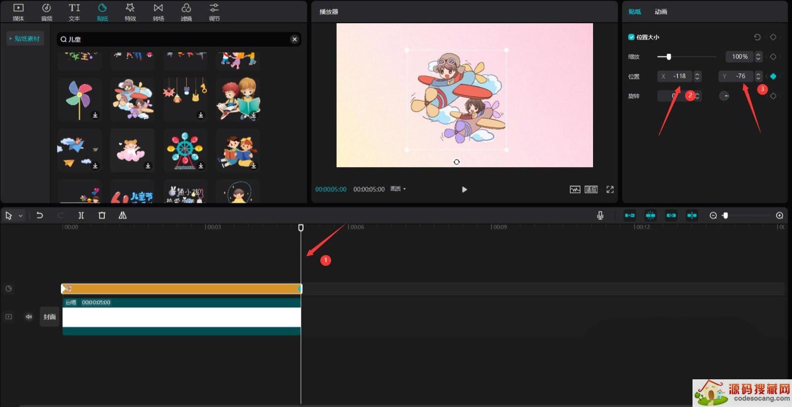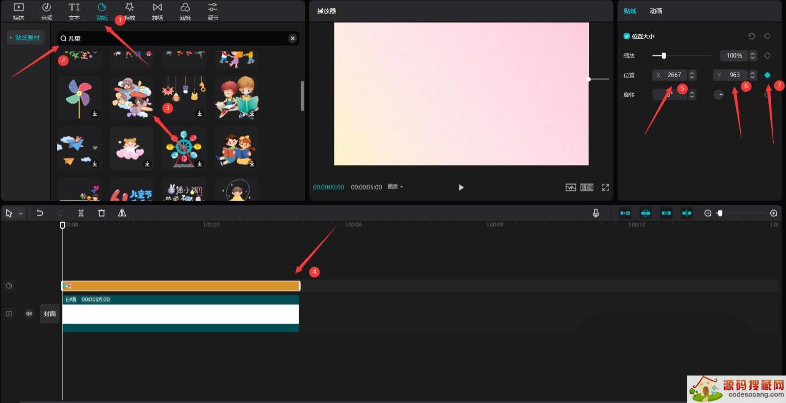 点击贴纸按钮,在搜索栏中输入儿童两字,选择一张贴纸,将其添加到贴纸轨道中,更改X为2667,Y为963,然后点击添加关键帧按钮,见下图。