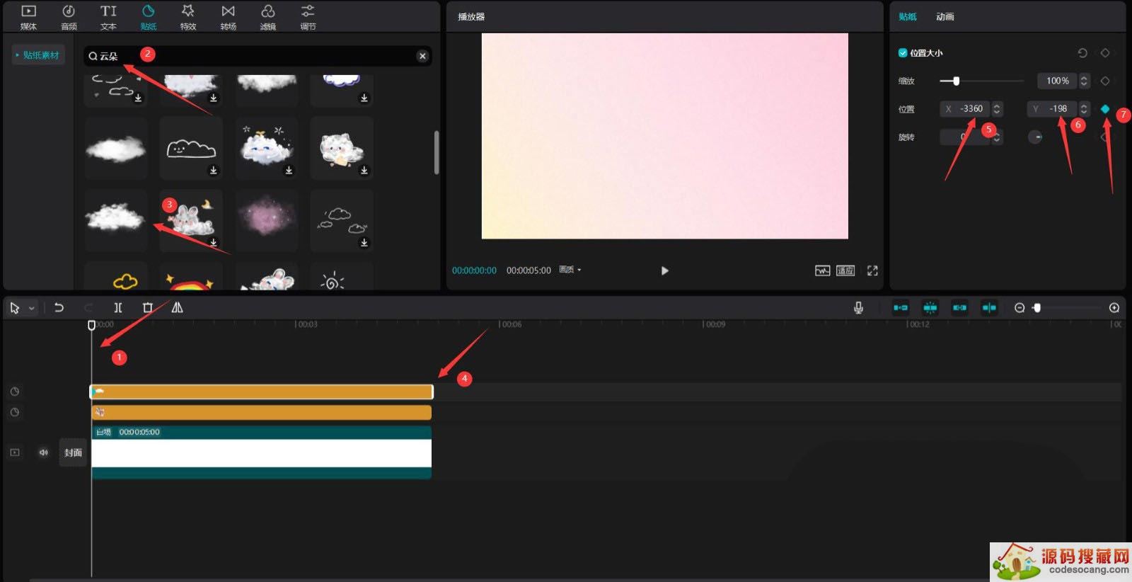 将时间轴移动到0秒处,在搜索栏中输入云朵两字,选择一张贴纸,将其添加到贴纸轨道中,更改X为-3360,Y为-198,然后点击添加关键帧按钮,见下图。
