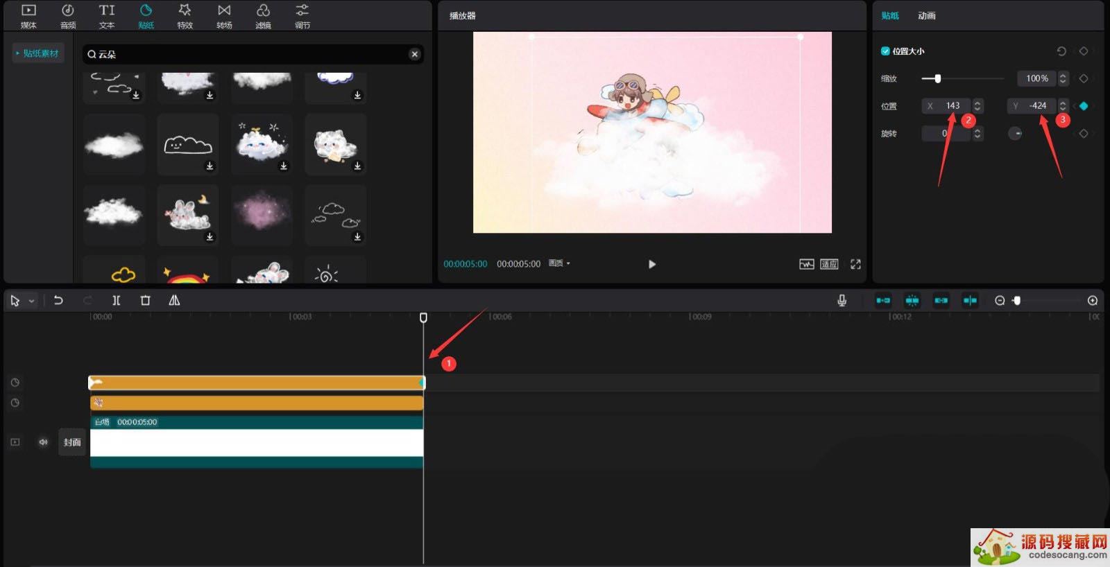 将时间轴移动到贴纸的末尾,更改X为143,Y为-424,见下图。