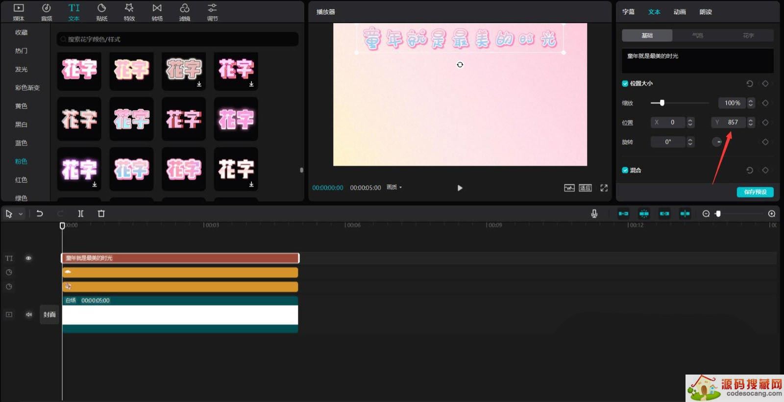 点击文本按钮,然后点击花字按钮,选择粉色花字中的一种,将其添加到文本轨道中,更改文本内容为你想展示的内容,字体为悠然体,见下图。