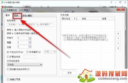 第三步:在“批量重命名”窗口中,点击“替换”选项卡。
