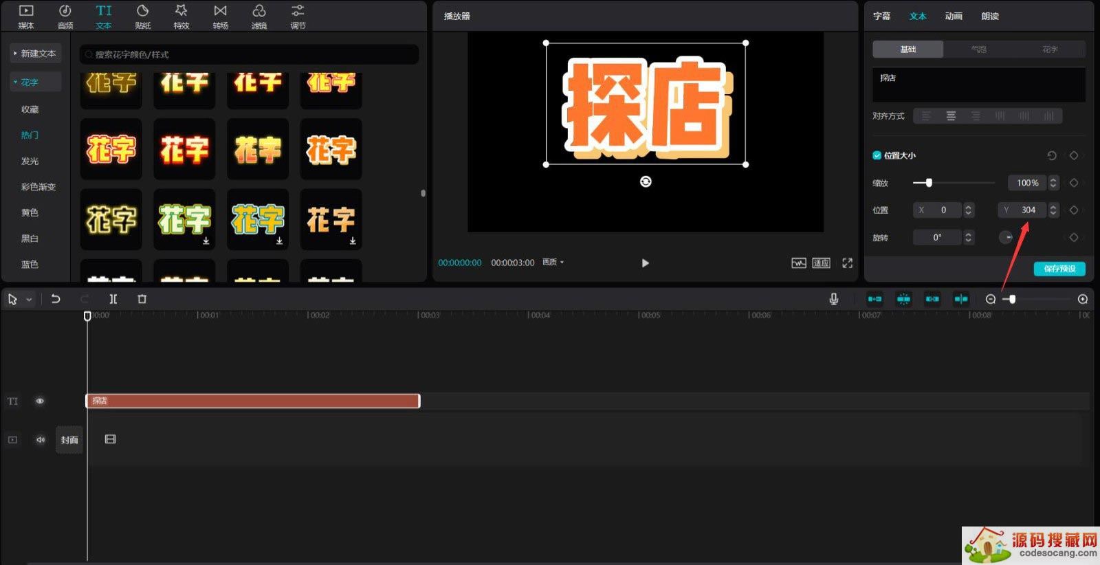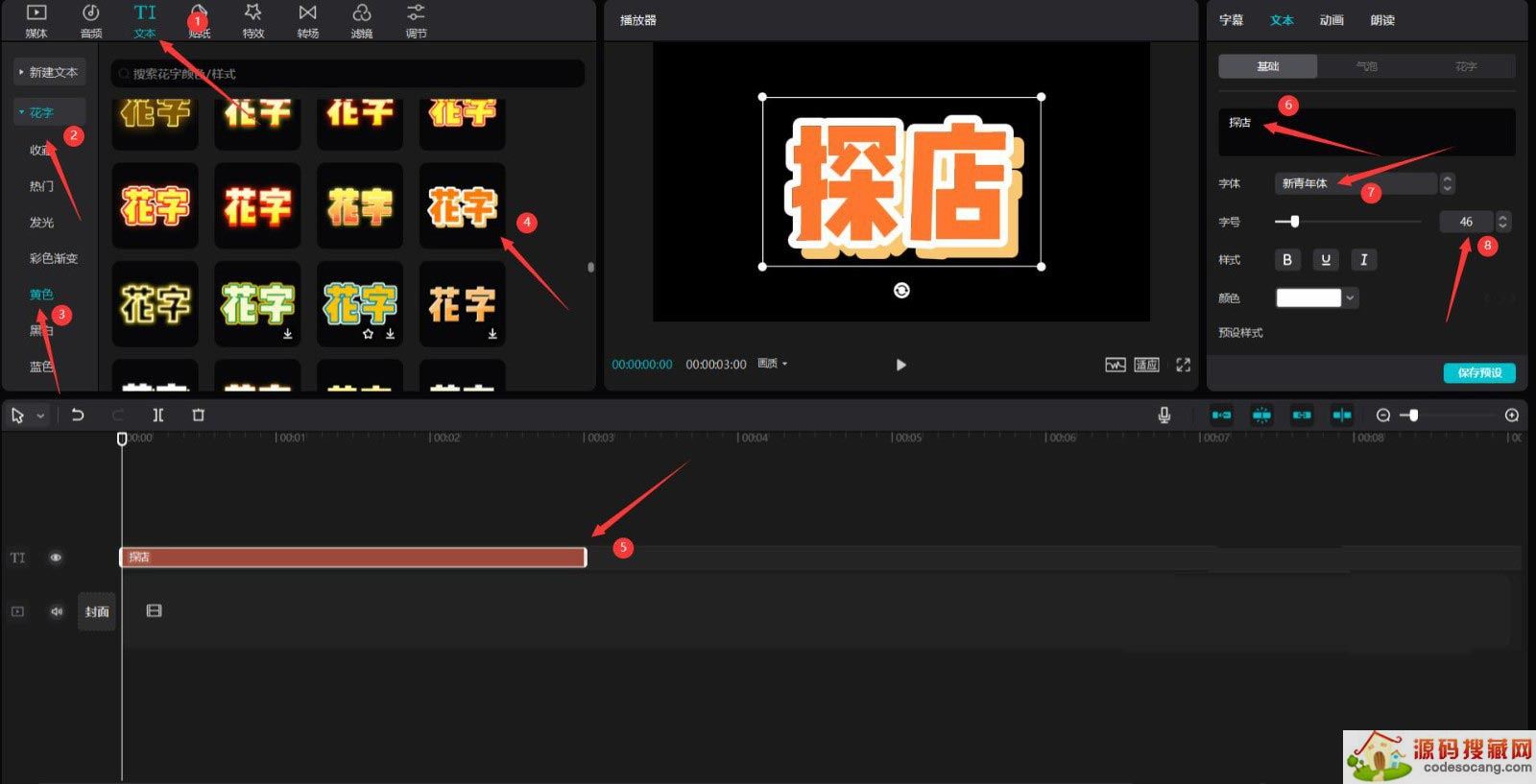 点击文本按钮,选择黄色花字中的一种,将其添加到文本轨道中,更改文本内容为"探店",字体为新青年体,字号为46,见下图。