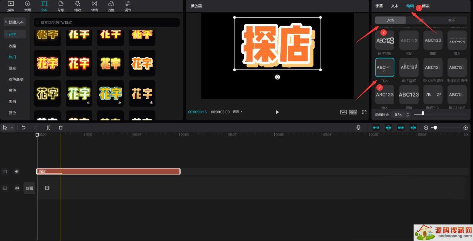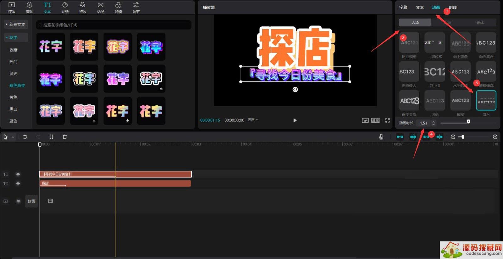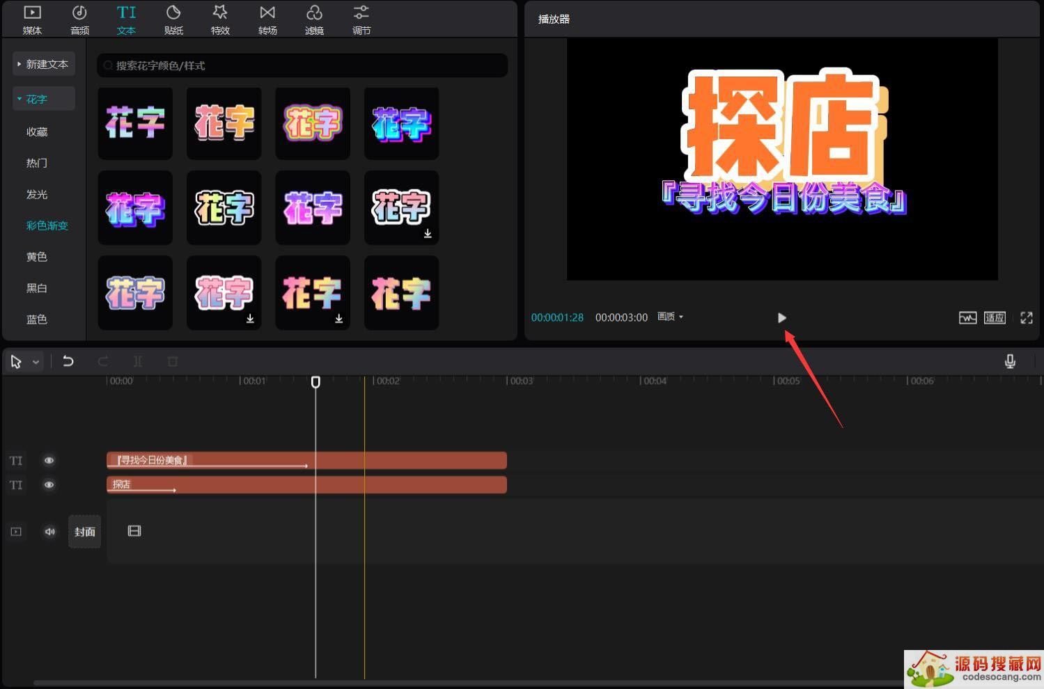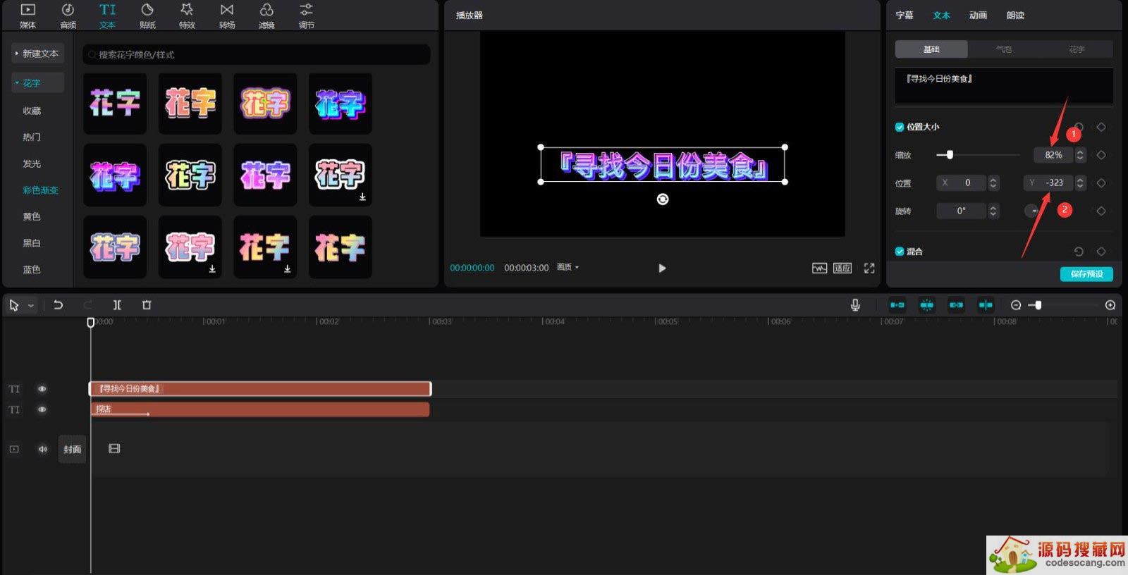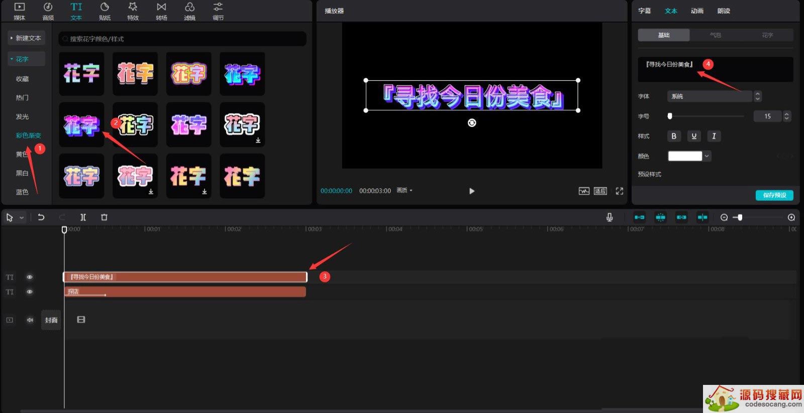 点击彩色渐变按钮,选择一种花字,将其添加到文本轨道中,更改文本内容为"『寻找今日份美食』",见下图。