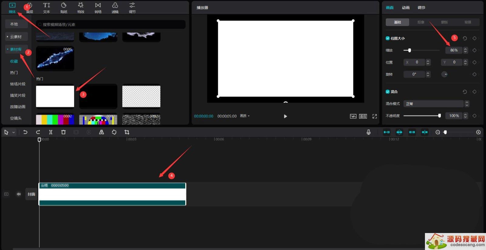 点击媒体按钮,然后点击素材库按钮,选择白场素材,将其添加到视频轨道中,更改缩放为86%,见下图。