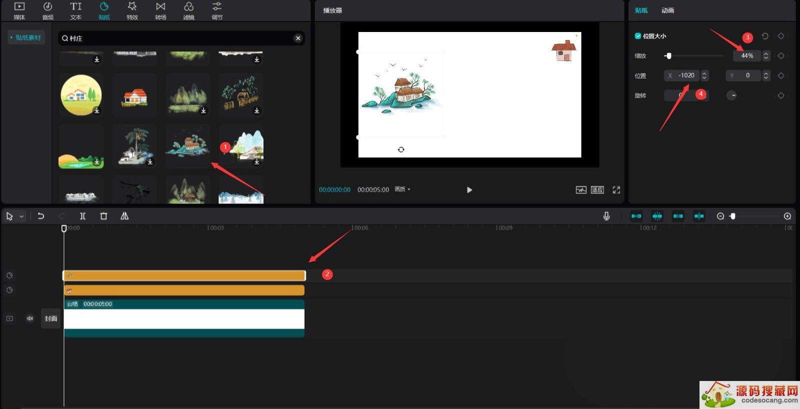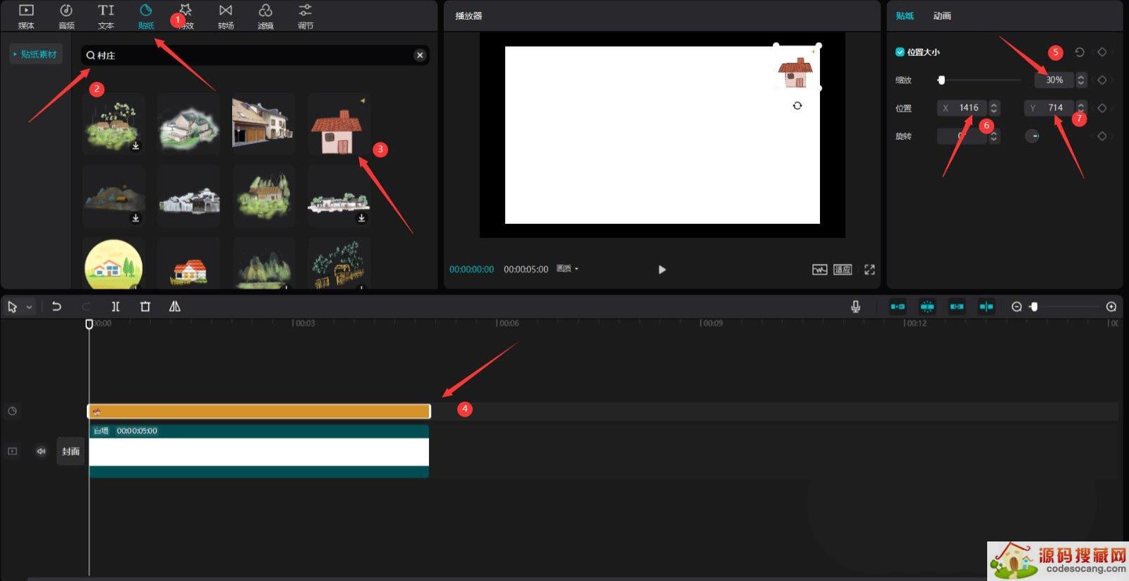 点击贴纸按钮,在搜索栏中输入村庄两字,选择一张贴纸,将其添加到贴纸轨道中,更改缩放为30%,X为1416,Y为714,见下图。