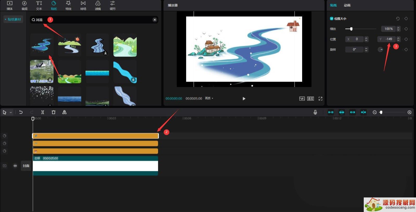 在搜索栏中输入河流两字,选择一张贴纸,将其添加到贴纸轨道中,更改Y为-149,见下图。