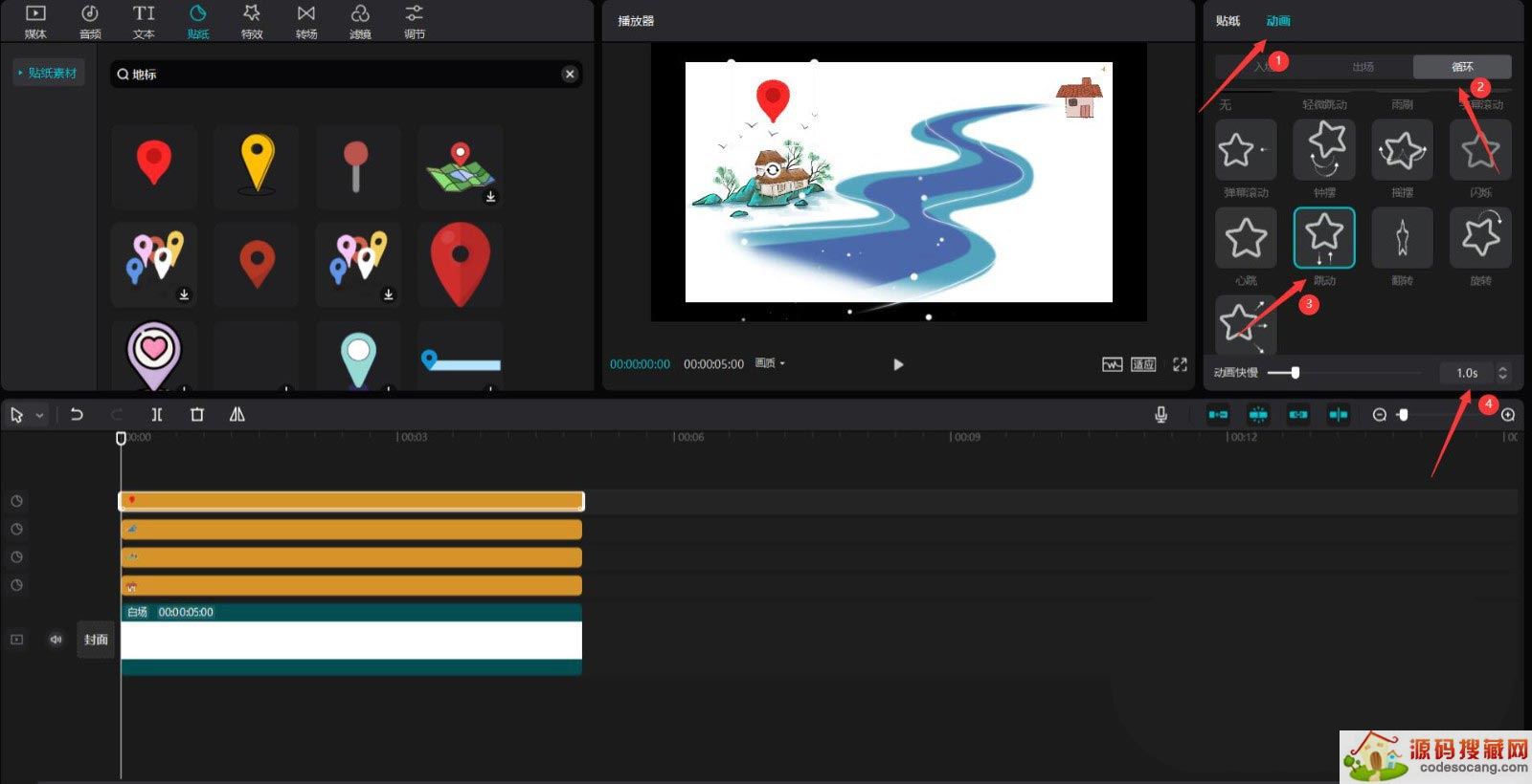 点击动画按钮,选择循环中的跳动,动画快慢调整为1秒,见下图。