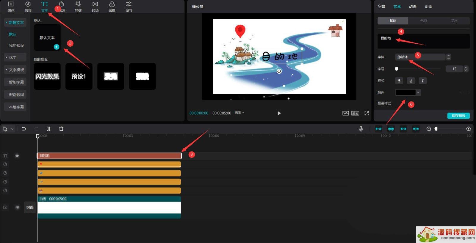 点击文本按钮,选择默认文本,将其添加到文本轨道中,更改文本内容为"目的地",字体为悠然体,颜色为黑色,见下图。