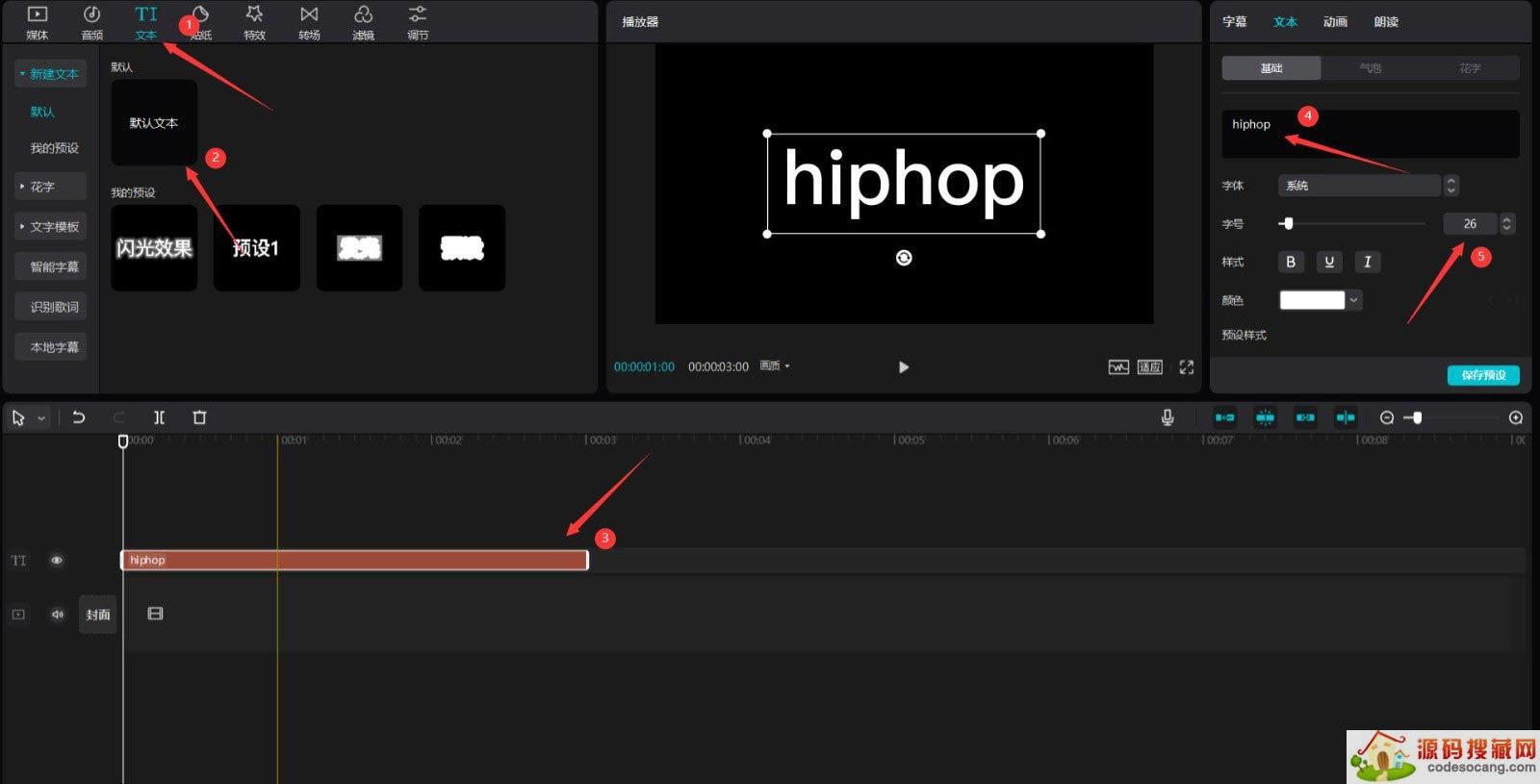 点击文本按钮,选择默认文本,将其添加到文本轨道中,更改文本内容为"hiphop",字号为26,见下图。