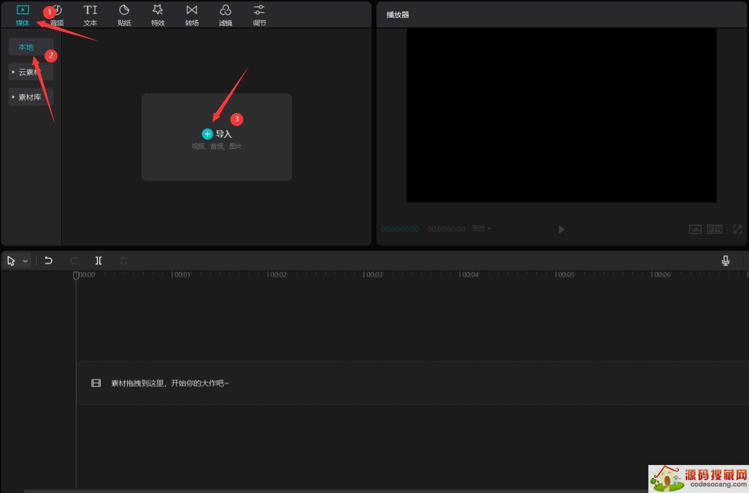 回到草稿,删除所有素材,点击媒体按钮,然后点击本地按钮,再点击导入按钮,导入刚才导出的视频,见下图。