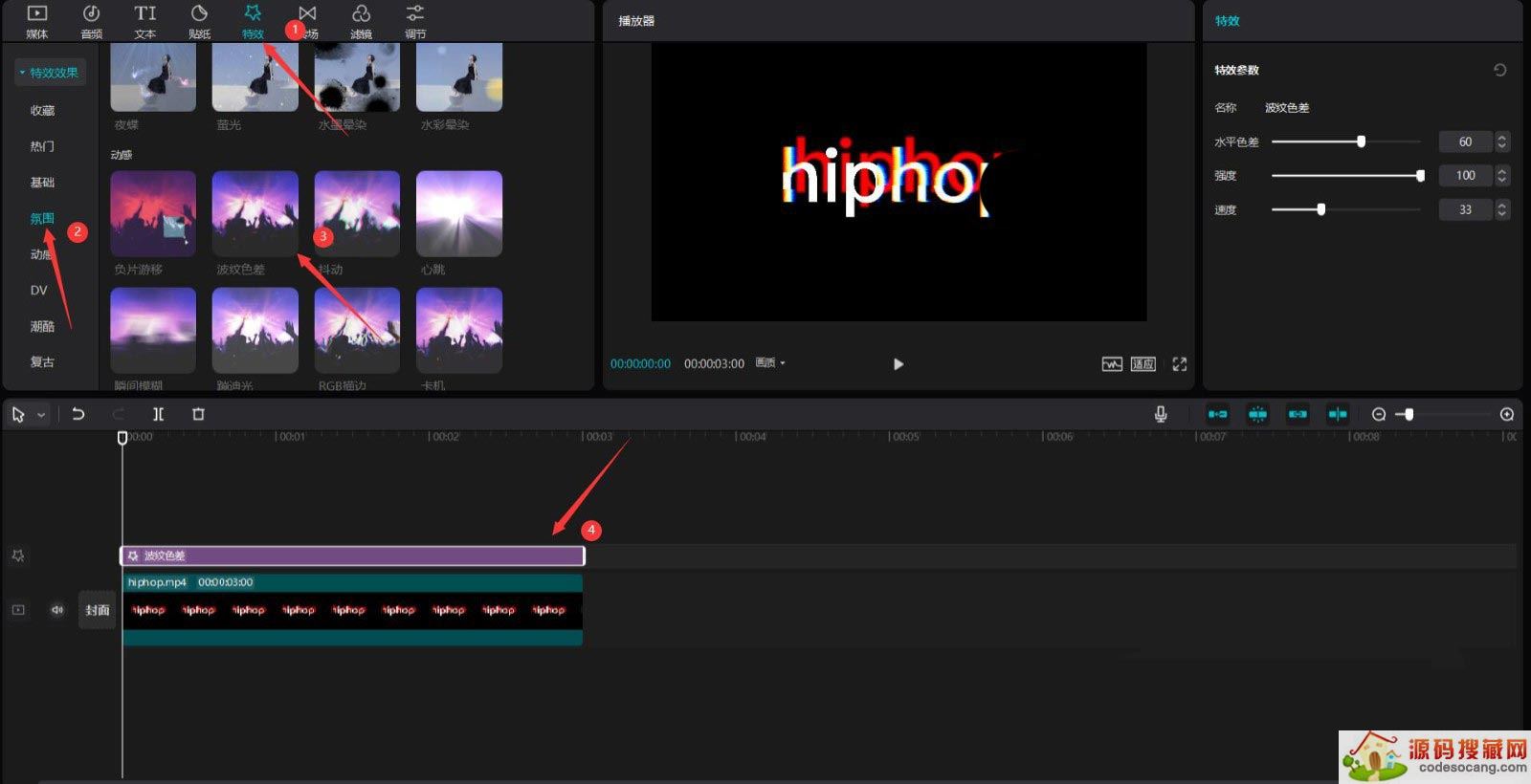 点击特效按钮,选择氛围中的波纹色差,将其添加到特效轨道中,见下图。