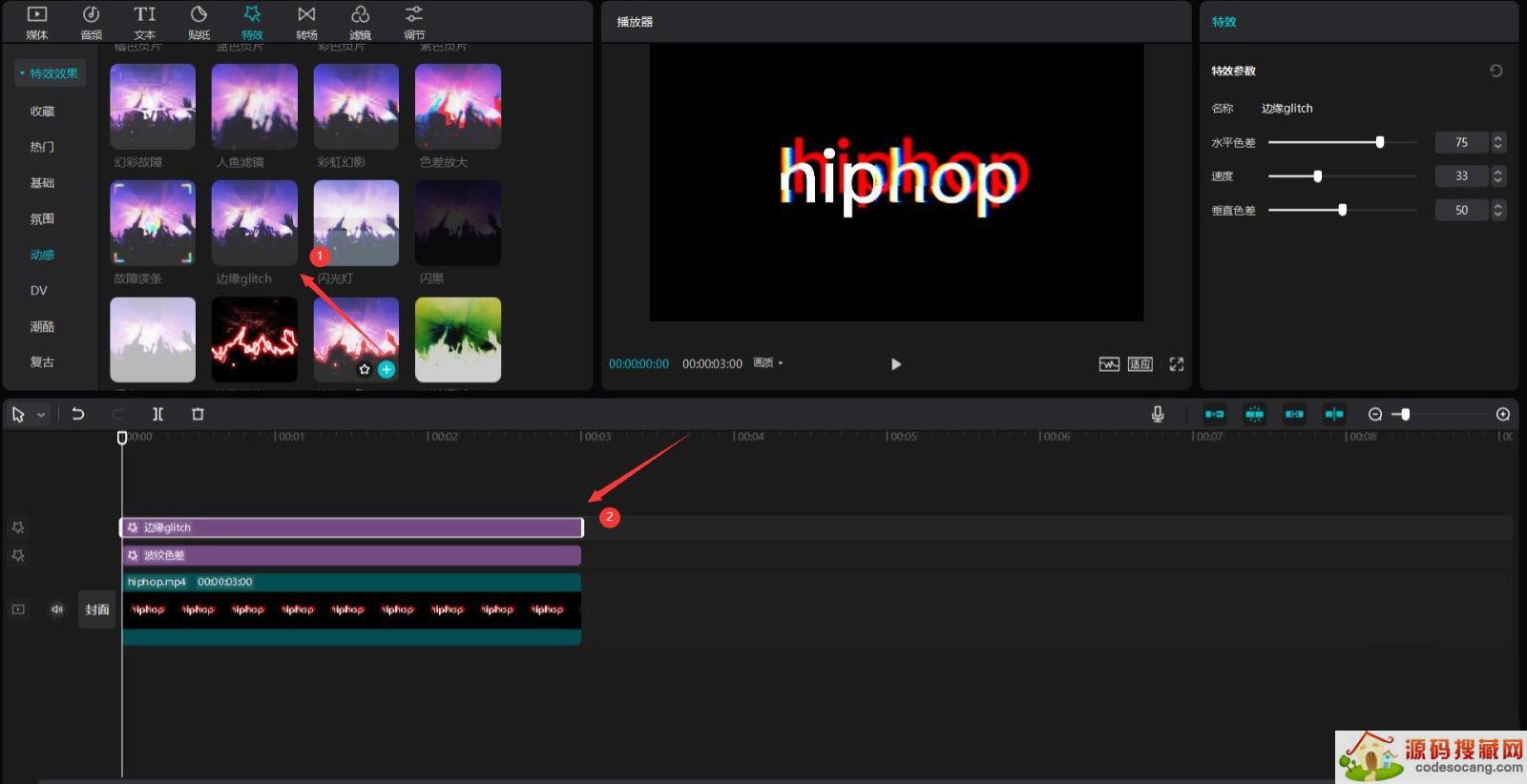 往下拉动滚动条,选择边缘glitch,将其添加到特效轨道中,见下图。