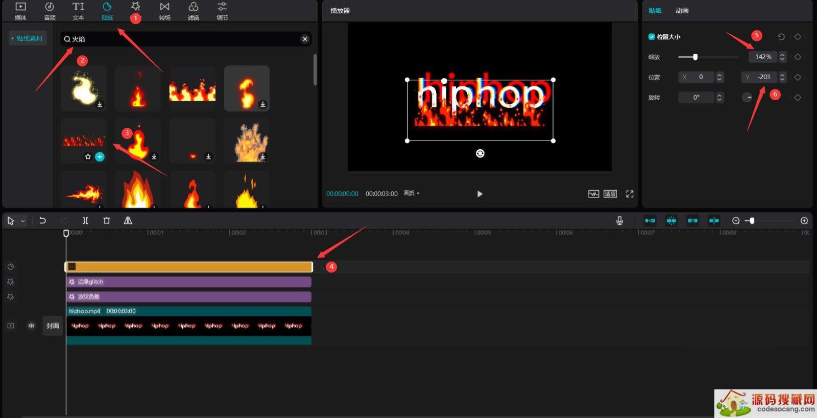点击贴纸按钮,在搜索栏中输入火焰两字,选择一张贴纸,将其添加到贴纸轨道中,更改缩放为142%,Y为-203,见下图。