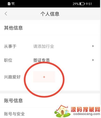 在个人信息页面内,点击兴趣爱好后【+】按钮。
