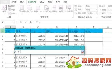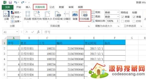 2、返回到excel工作表中,切换到页面布局选项卡,这里可以看到有一“打印标题”的选项,点击这个图标。