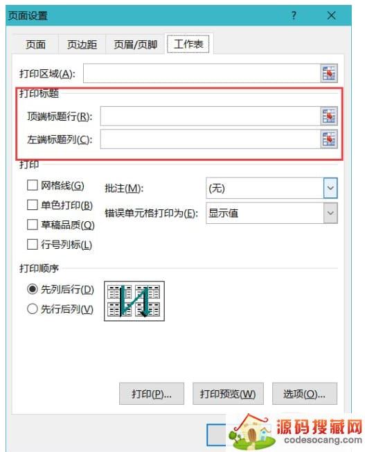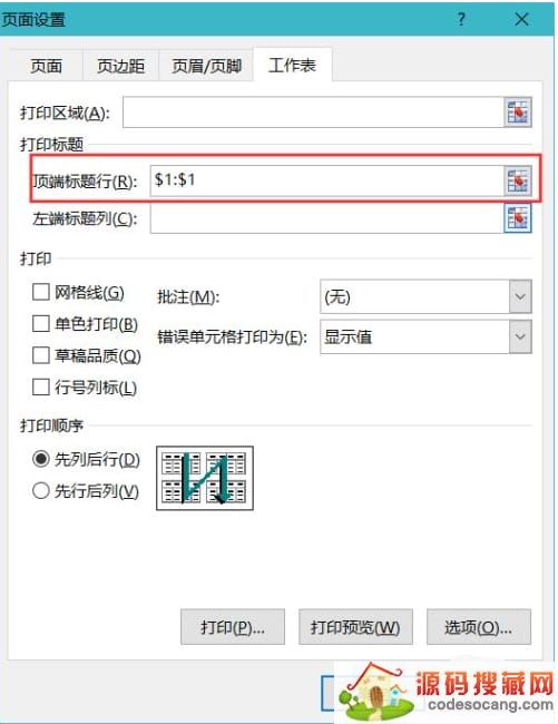 3、进入到页面设置项,打印标题可以设置顶端标题行,左端标题列,我们这里属于顶端标题行。