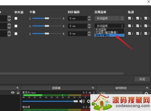 5、找到媒体源对应的“音频监听”列,点击下拉列表选择“监听并输出”。